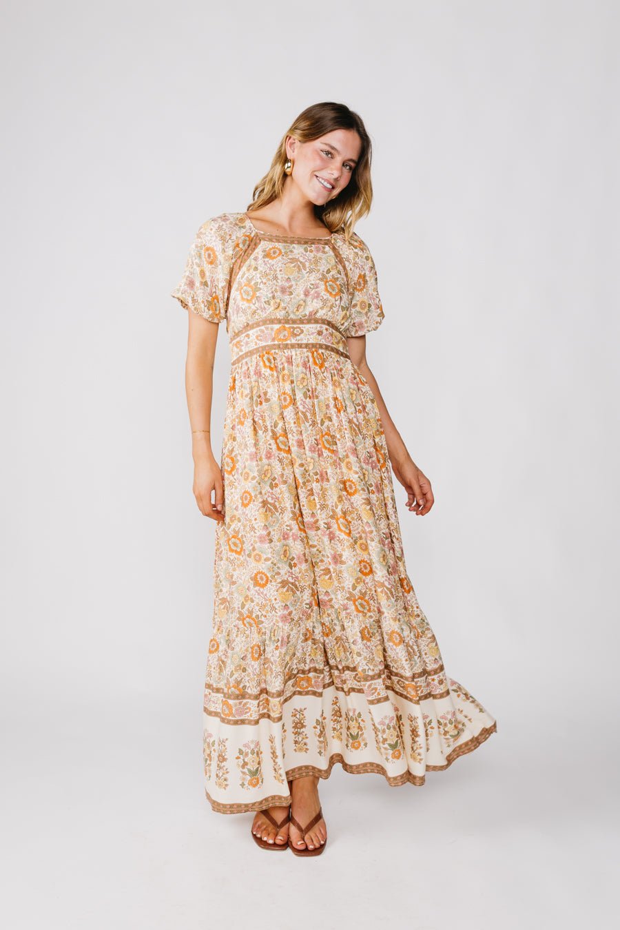 - Floral print dress with border design
